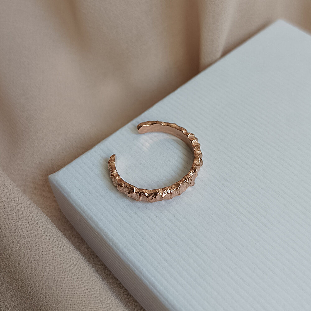 Stylové růžově pozlacené náušnice typu „ear climber“ s výraznou strukturální povrchovou úpravou, která při dopadu světla rozehrává dramatickou hru světel a stínů.