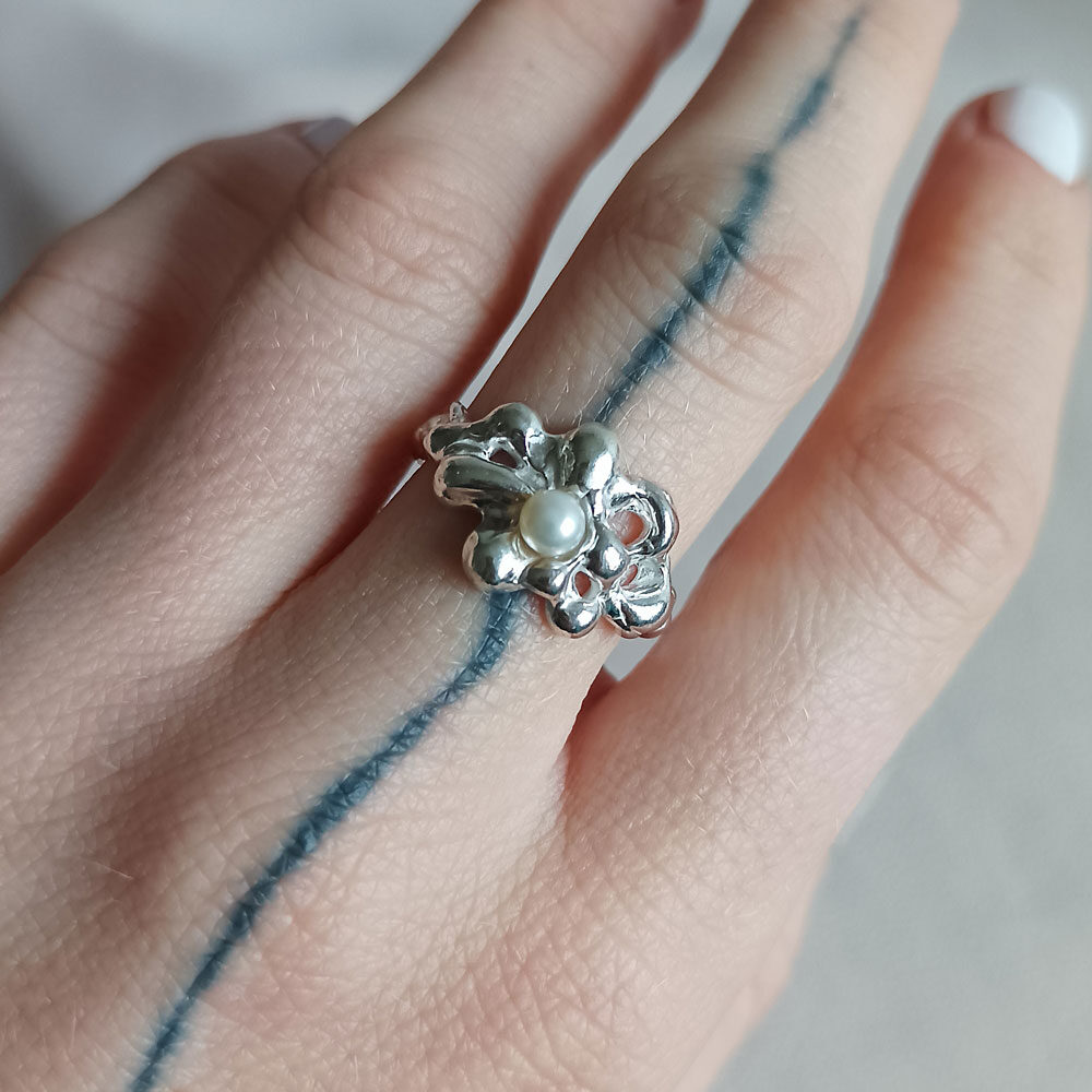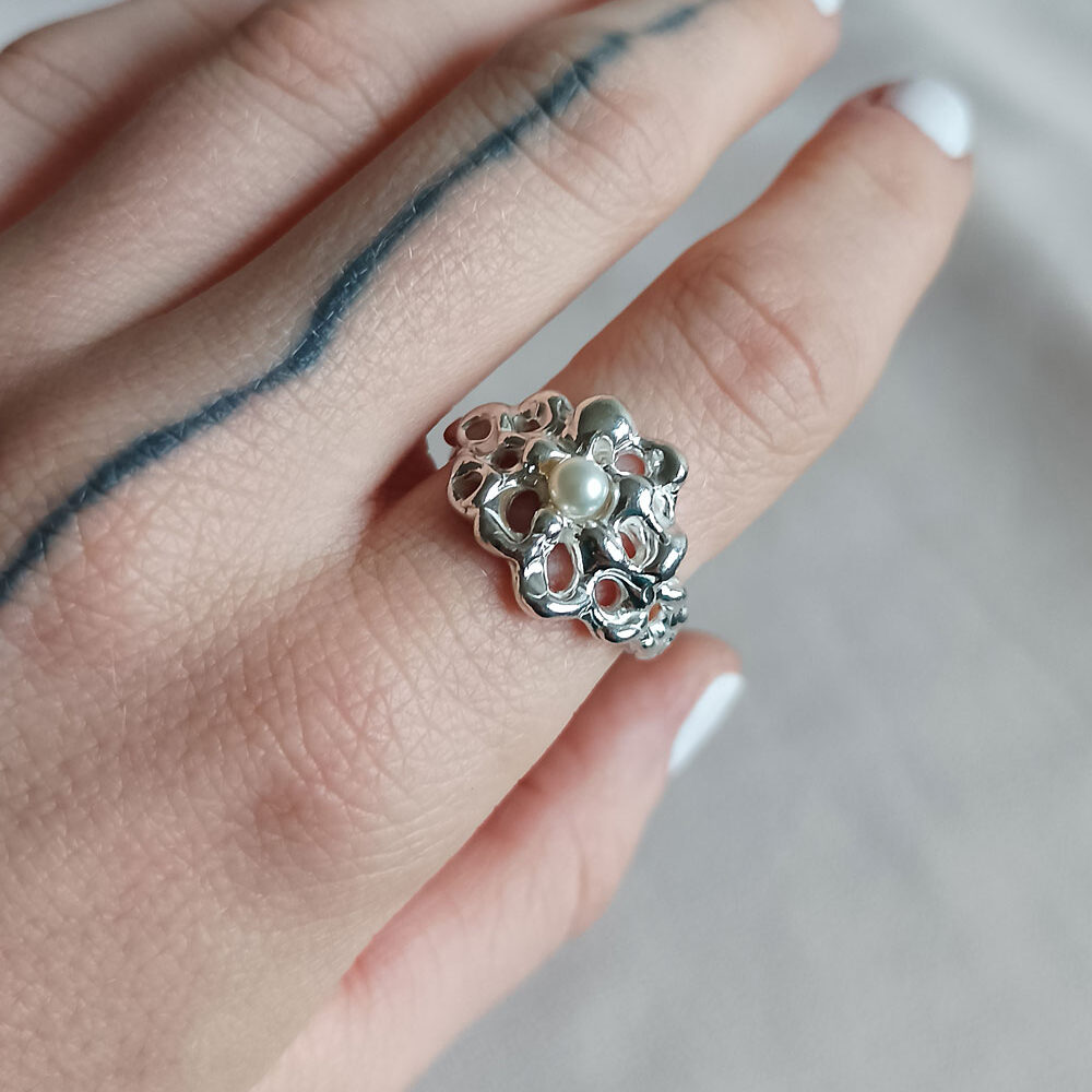 Každý kus je ručně tvarovaný, a proto je každý neopakovatelný originál. Přestože má prsten výrazný charakter, přírodní perla mu dodává jemnost a křehkou rovnováhu.