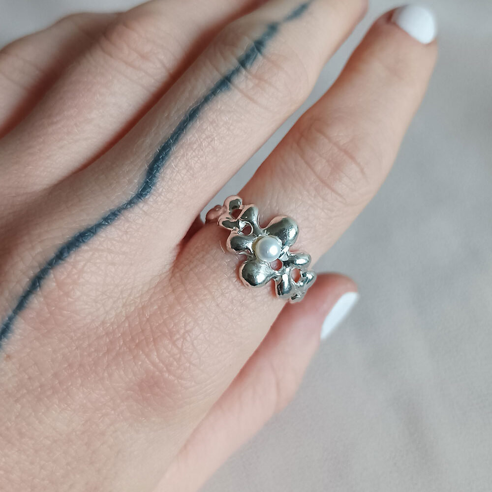 Stříbrný prsten Fluid bloom s bílou říční perlou, Ag 925/1000 – 08