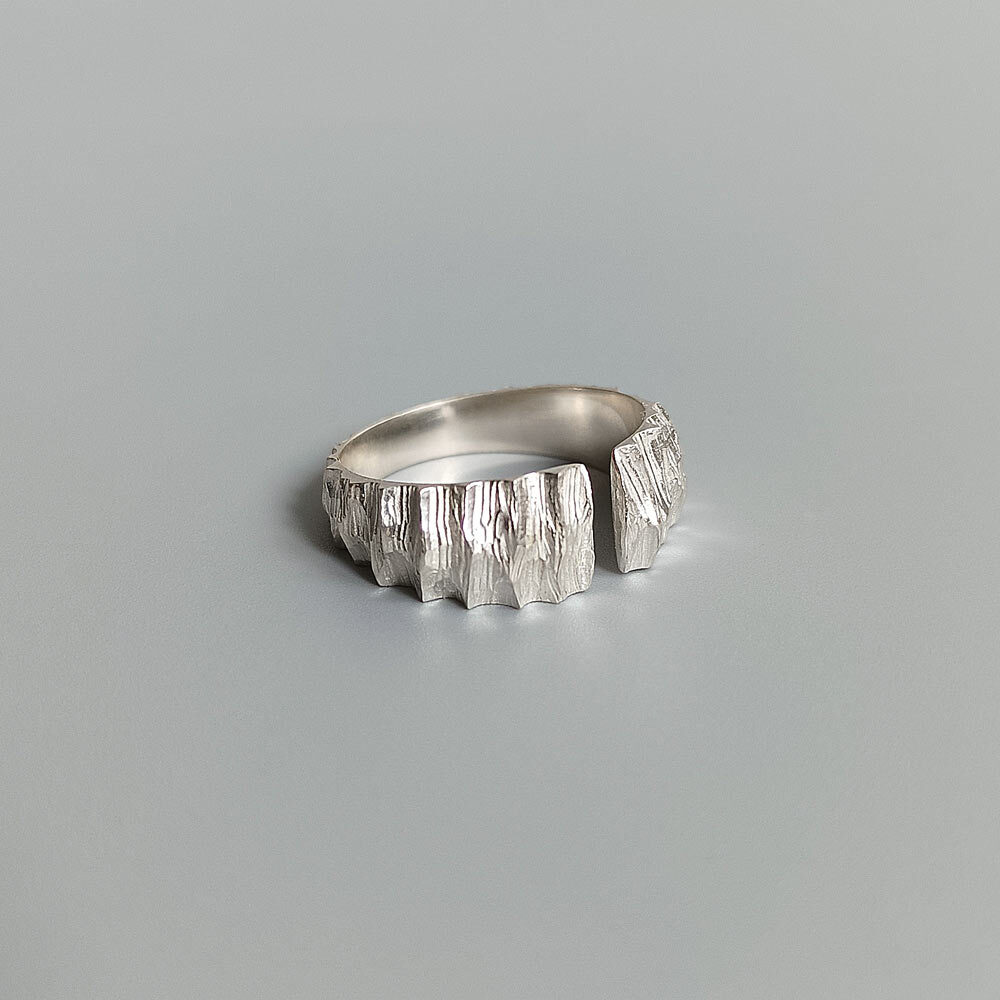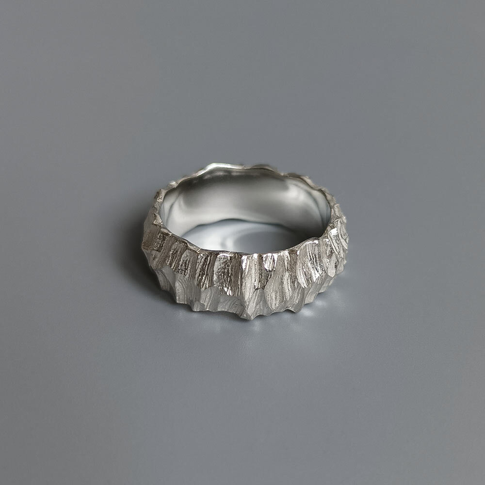 Minimalistický široký stříbrný prsten s tepaným povrchem pro ty, co mají rádi výraznější šperky.